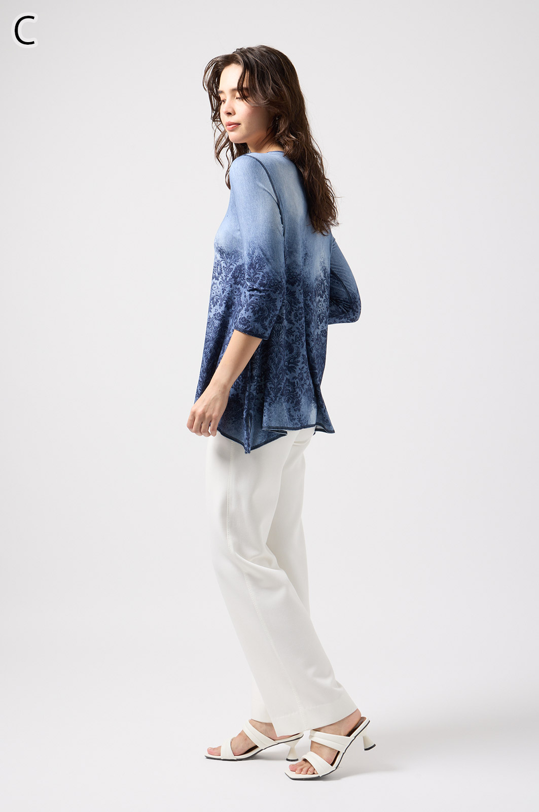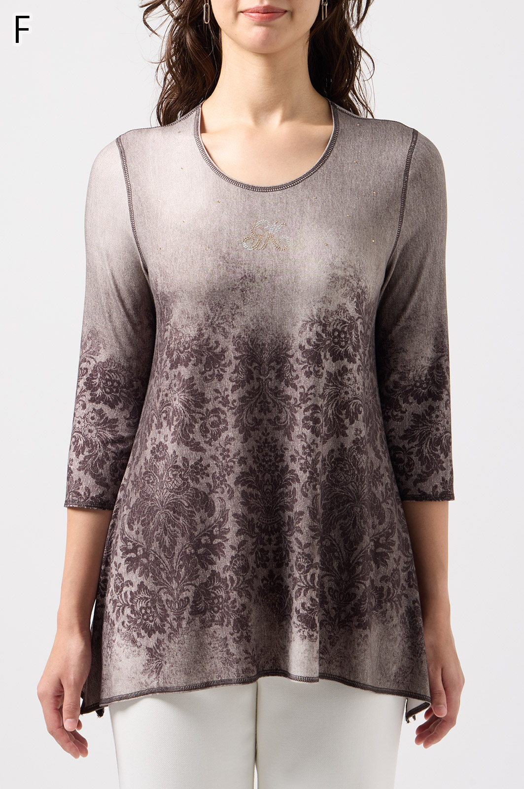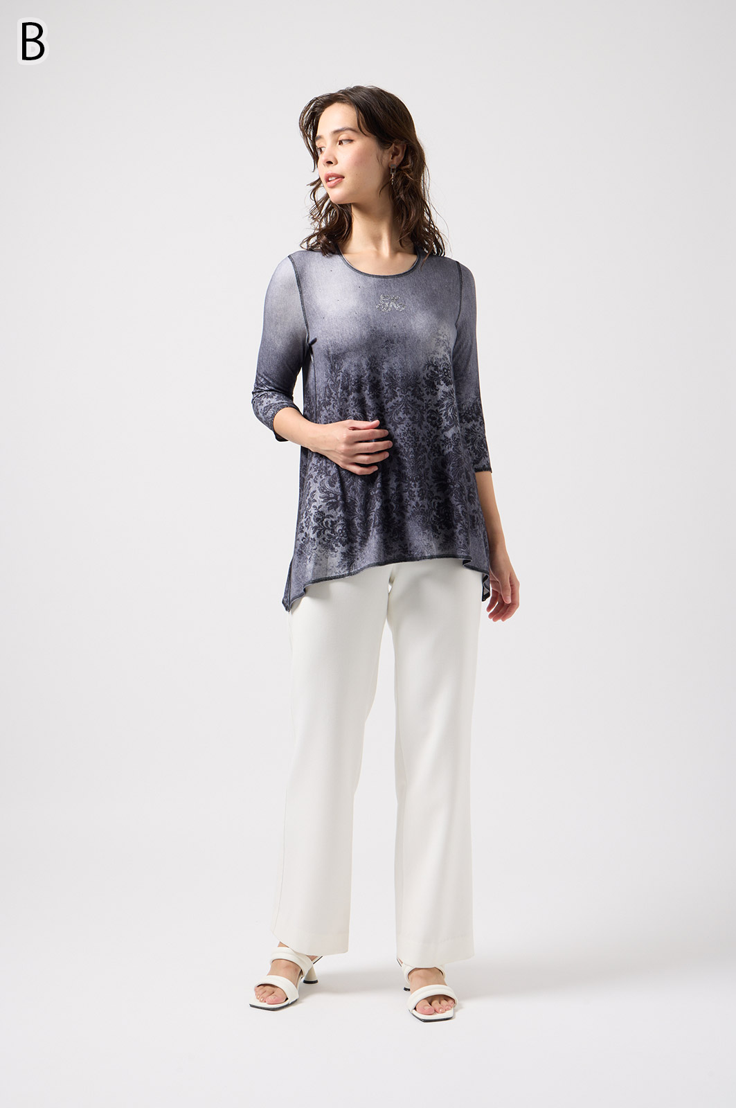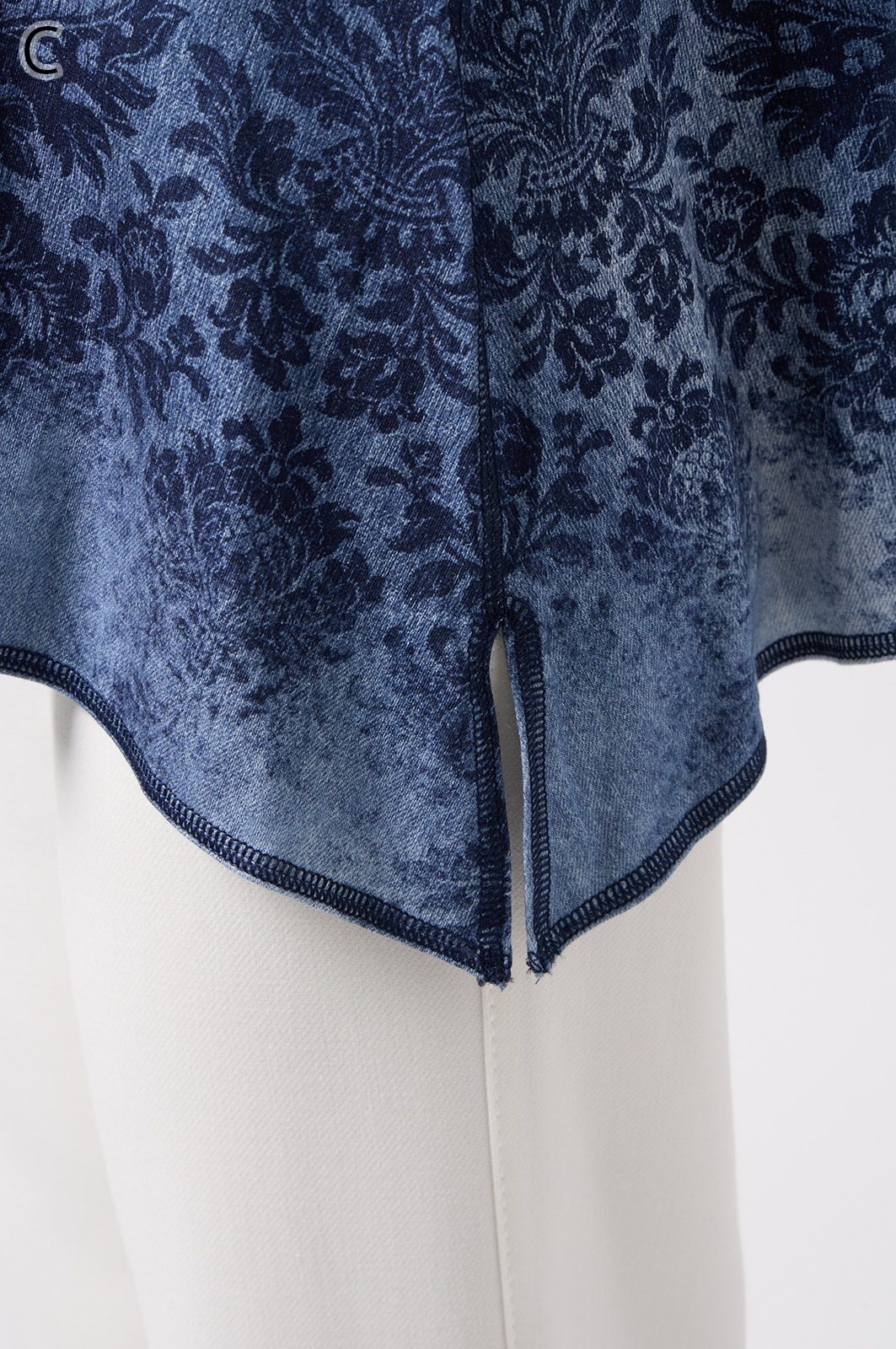 柔らかなレーヨンニットでドレープが美しいAラインTシャツ。腰をすっぽり隠す安心丈に、アラベスク調のプリントが上品な華やかさを添えます。