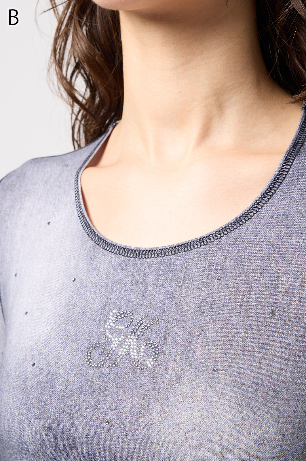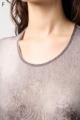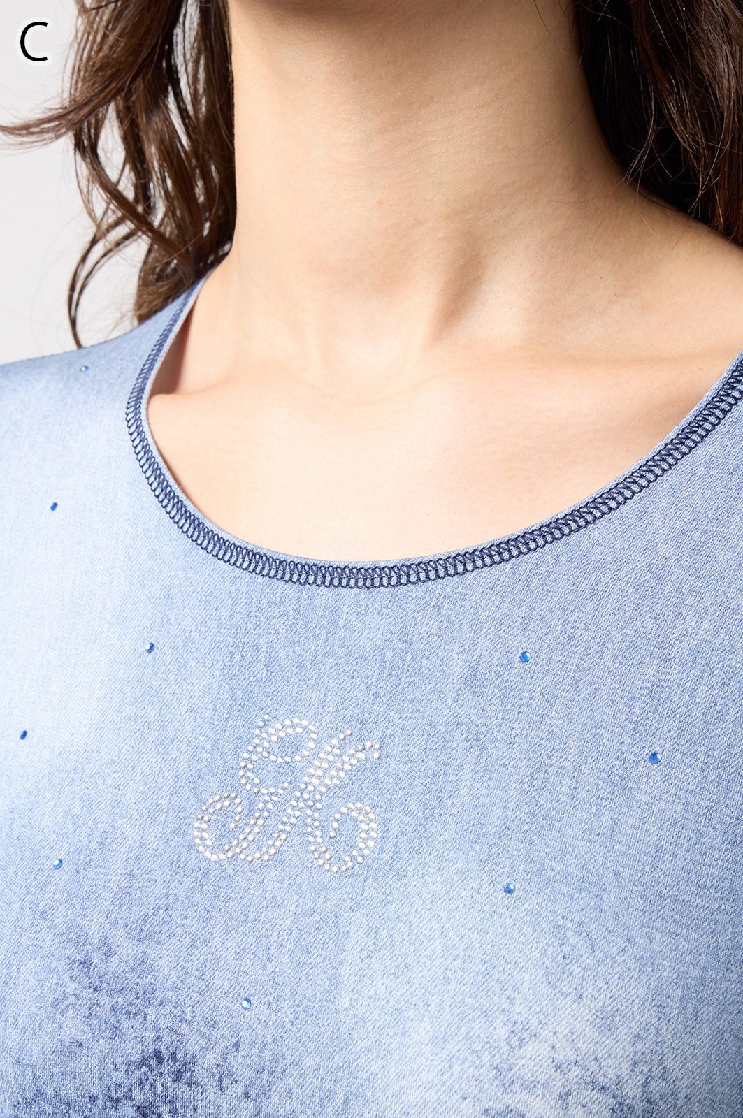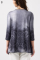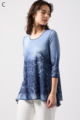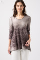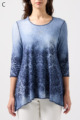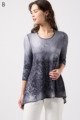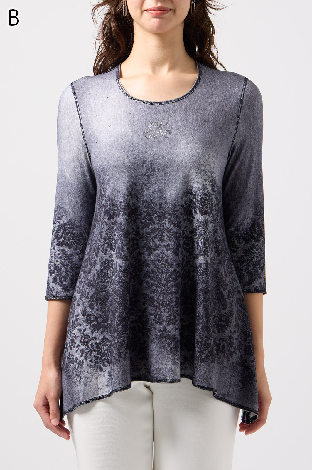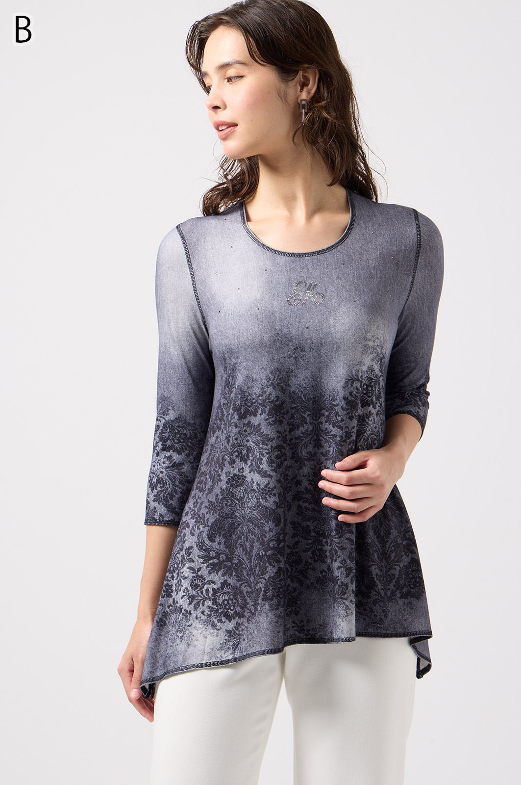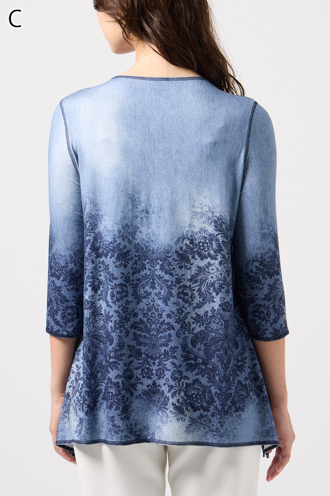 柔らかなレーヨンニットでドレープが美しいAラインTシャツ。腰をすっぽり隠す安心丈に、アラベスク調のプリントが上品な華やかさを添えます。