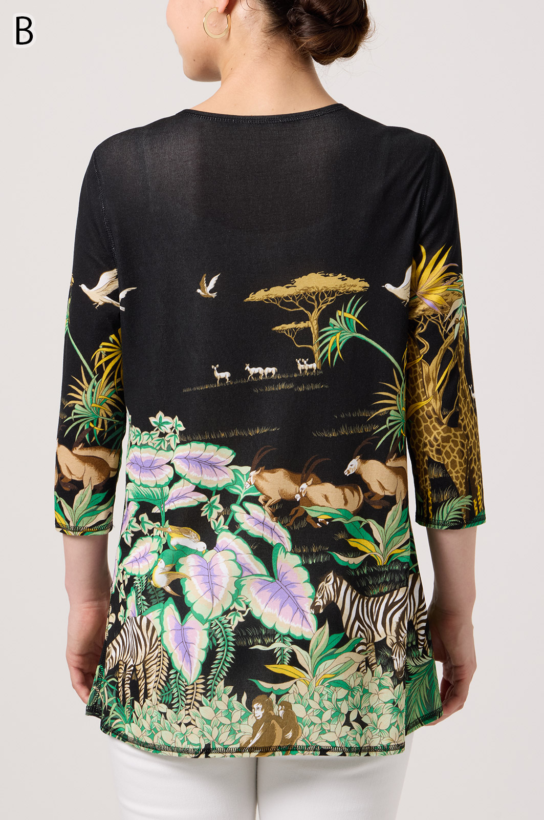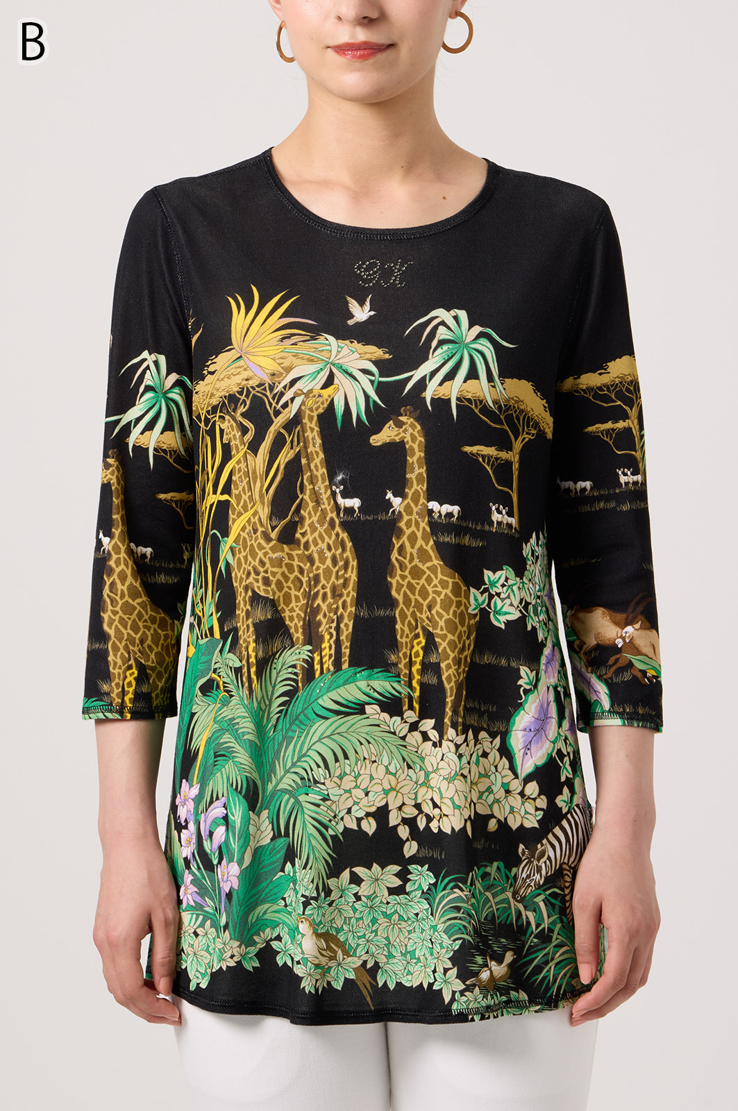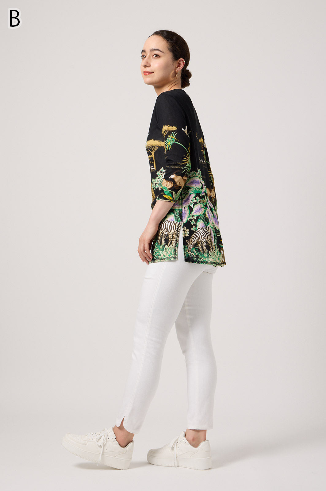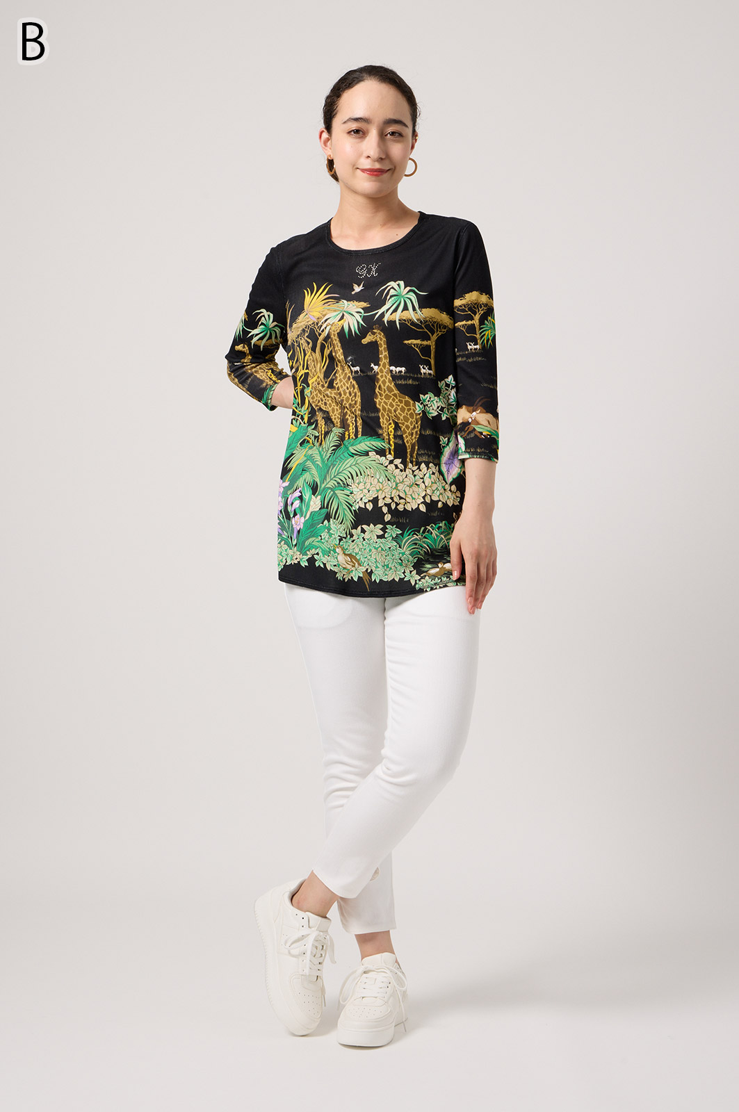 サバンナ風の模様が目を引く、やわらかな綿素材の七分袖Tシャツ。Aラインで体型をさりげなくカバーし、夏にぴったりの軽やかさです。