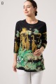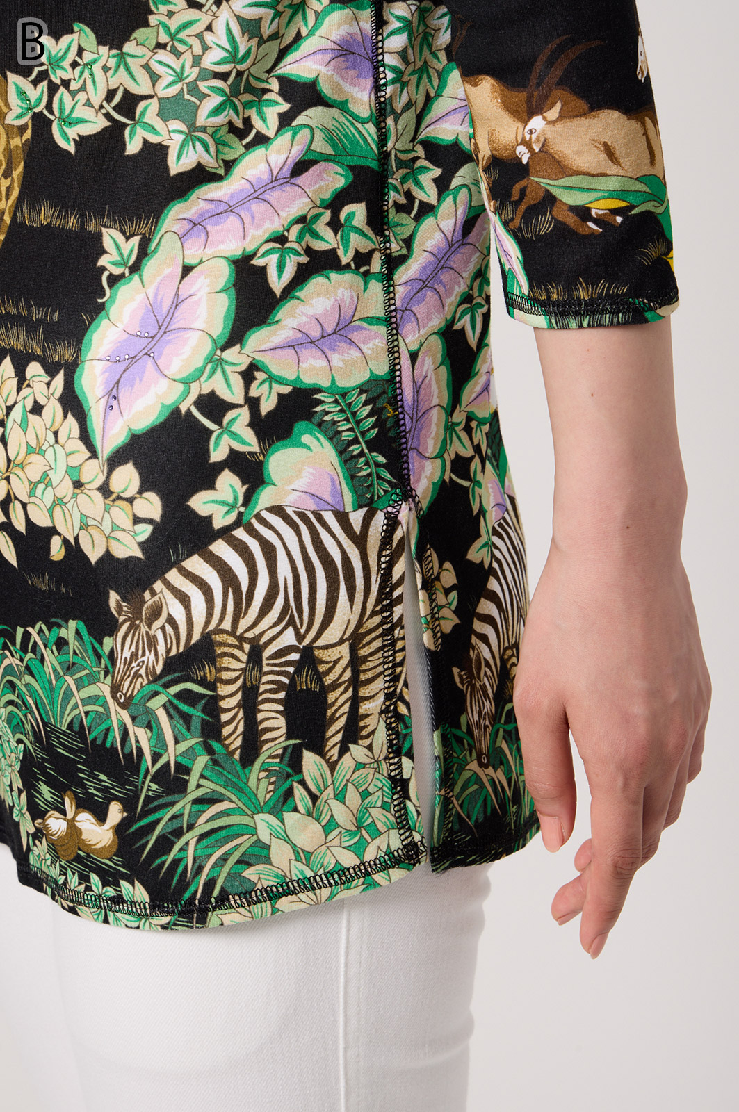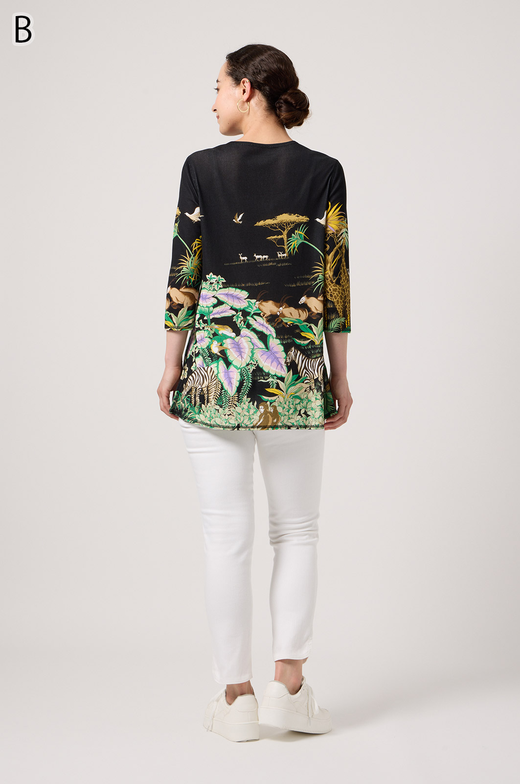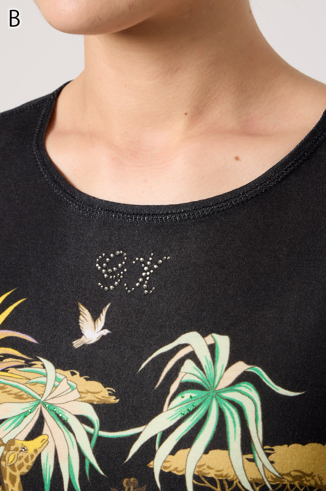 サバンナ風の模様が目を引く、やわらかな綿素材の七分袖Tシャツ。Aラインで体型をさりげなくカバーし、夏にぴったりの軽やかさです。